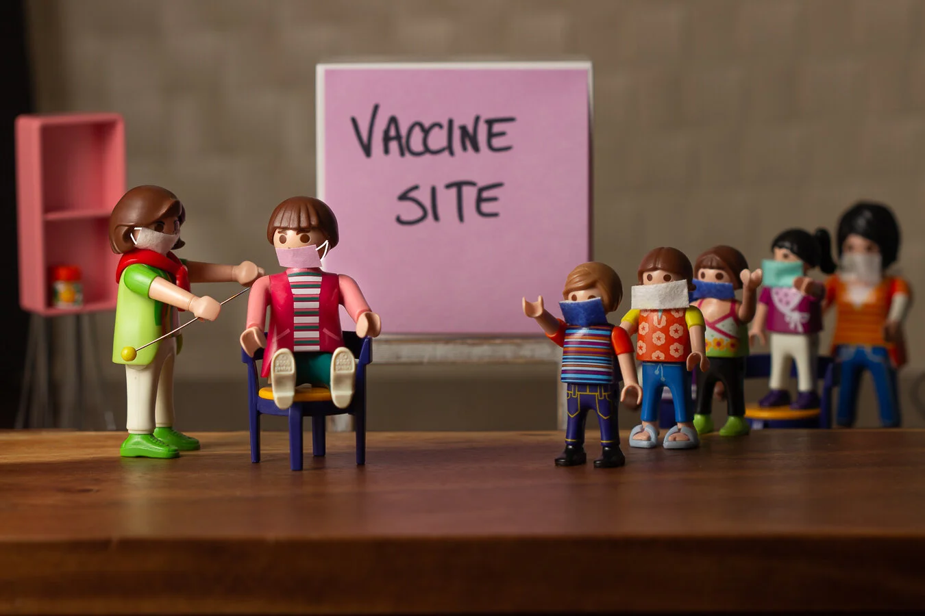 With all the buzz about the new Covid-19 vaccine, I was inspired to create a scene depicting the enthusiastic response to the vaccine amidst the pandemic craziness. Here in New York State, Phase 1B is already lining up and rolling up their sleeves with the hope that this is the first step to combat the pandemic. Using miniatures and objects from around the house, I set up these toys, making sure to “mask” each individual. Cheering while on line, the mood is palpable!